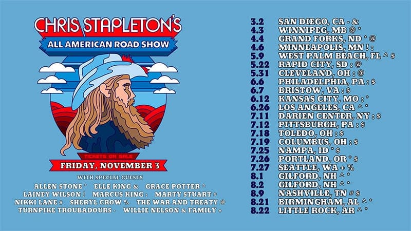 - Chris Stapleton will be visiting various cities across the country during his Tour 2026. The full list of cities can be found on his official website.